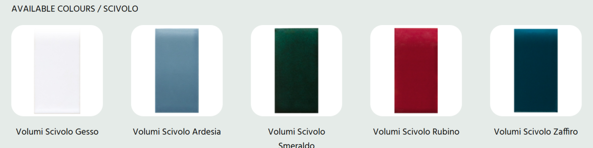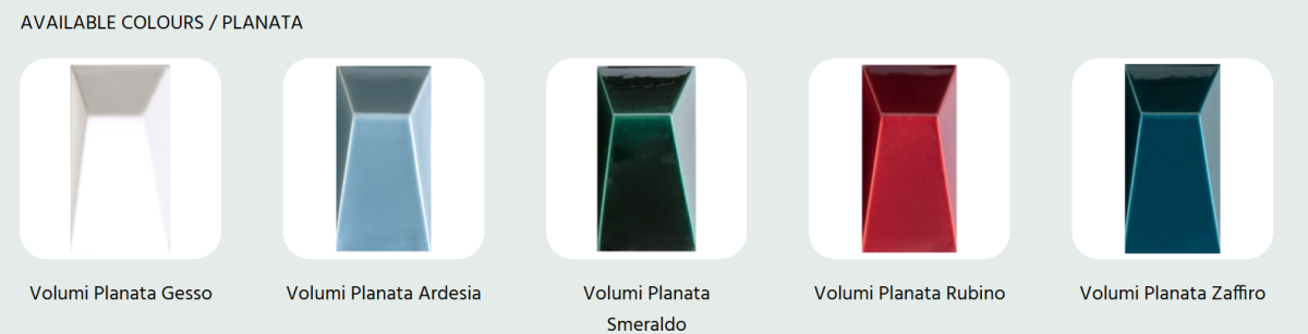 La colección Volumi celebra la artesanía y la tridimensionalidad a través de las estructuras Planata y Scivolo. Los esmaltes aplicados a mano se mueven sobre las superficies con matices aleatorios, realzando el carácter único de lo artesanal y aportando un dinamismo visual imposible de replicar industrialmente.