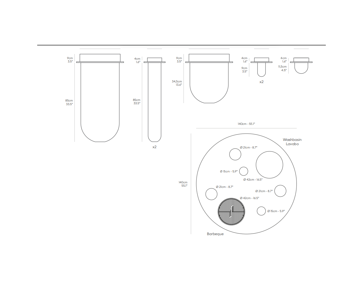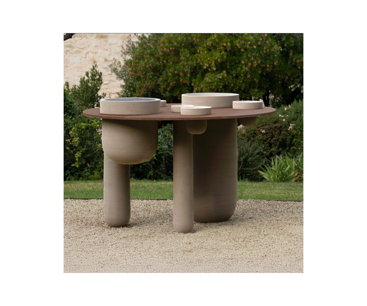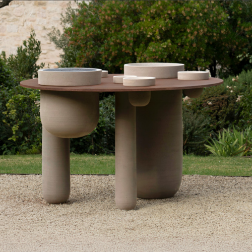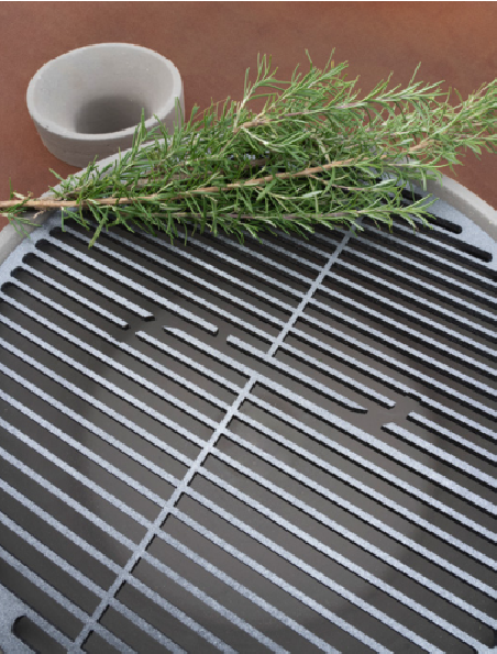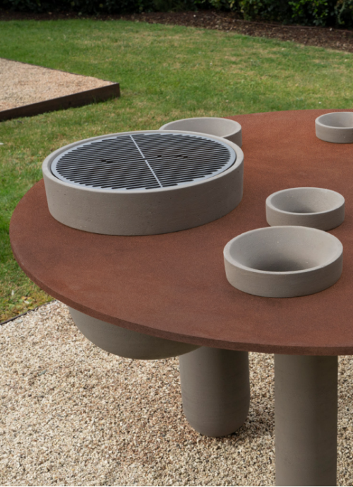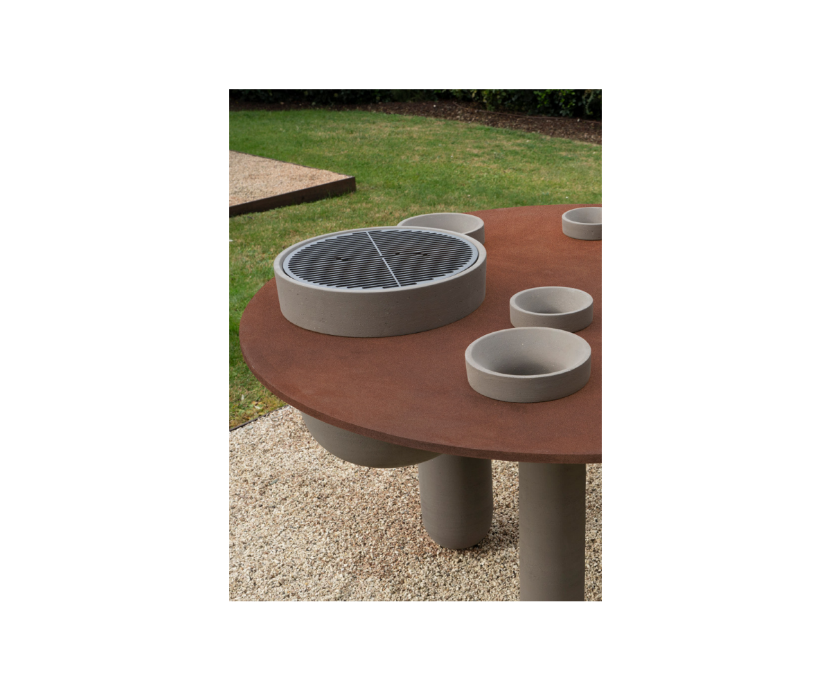 LuneUp+BBQ está diseñada para fomentar la convivencia y está pensada principalmente para exteriores. Los tres elementos estructurales son la barbacoa suspendida. Disponible en todos los acabados y materiales terrosos, esta composición combina fuego y agua, ofreciendo una experiencia culinaria completa.