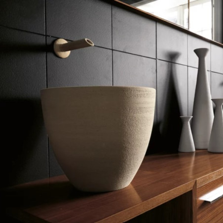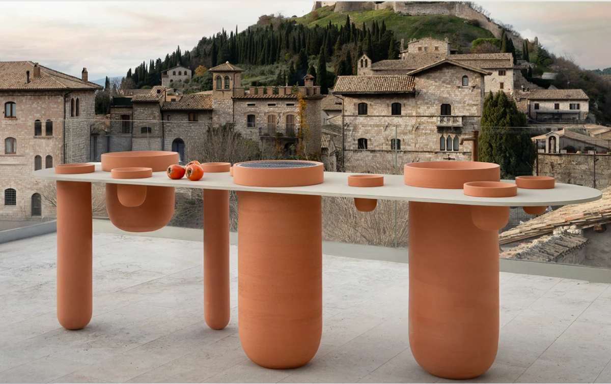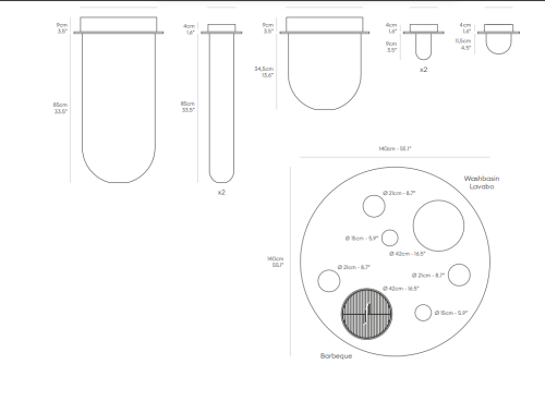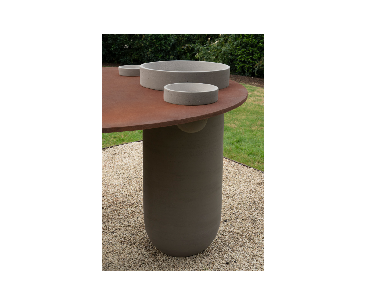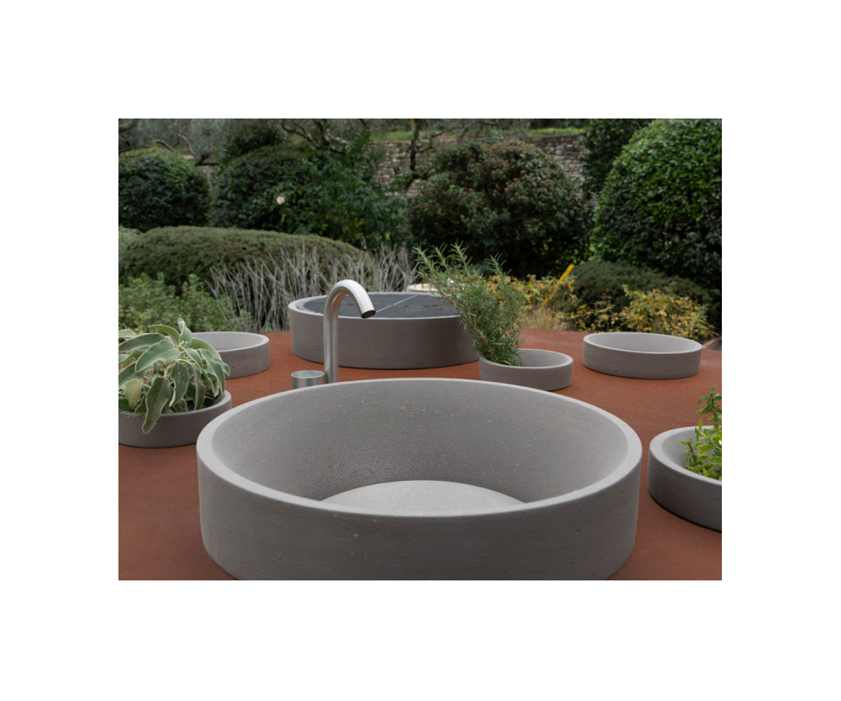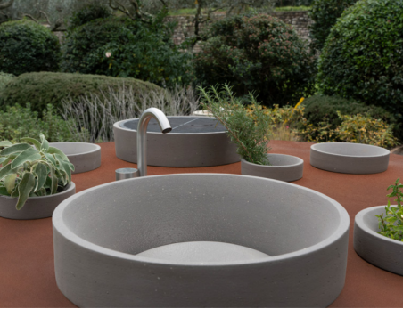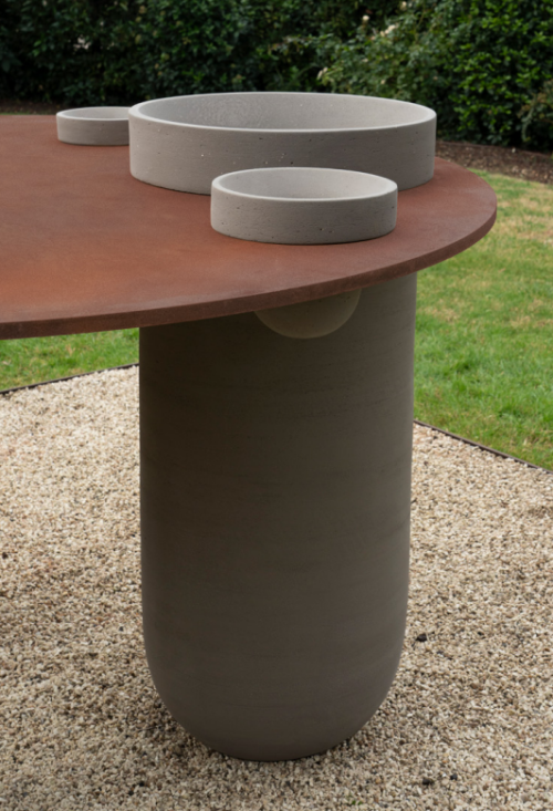 LuneUp+BBQ está diseñada para fomentar la convivencia y está pensada principalmente para exteriores. Los tres elementos estructurales son la barbacoa suspendida. Disponible en todos los acabados y materiales terrosos, esta composición combina fuego y agua, ofreciendo una experiencia culinaria completa.