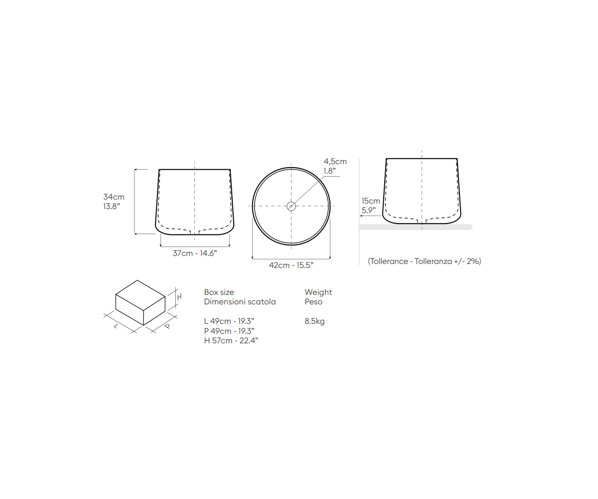Terzofoco Materic Line "Ciocco Giara", es un lavabo sobre encimera de porcelana gris torneado a mano. Interior blanco brillo, exterior acabado natural. Válvula incluida.