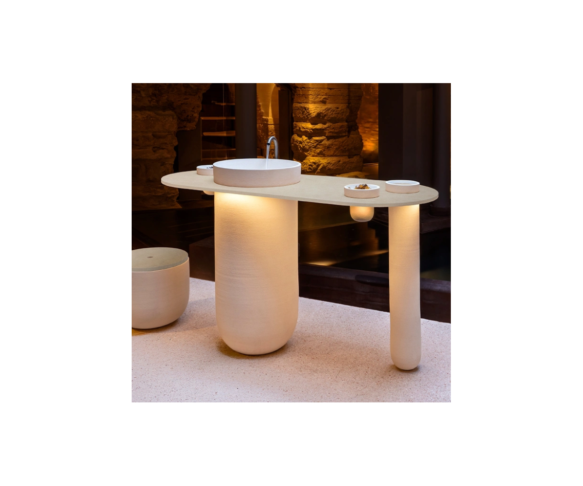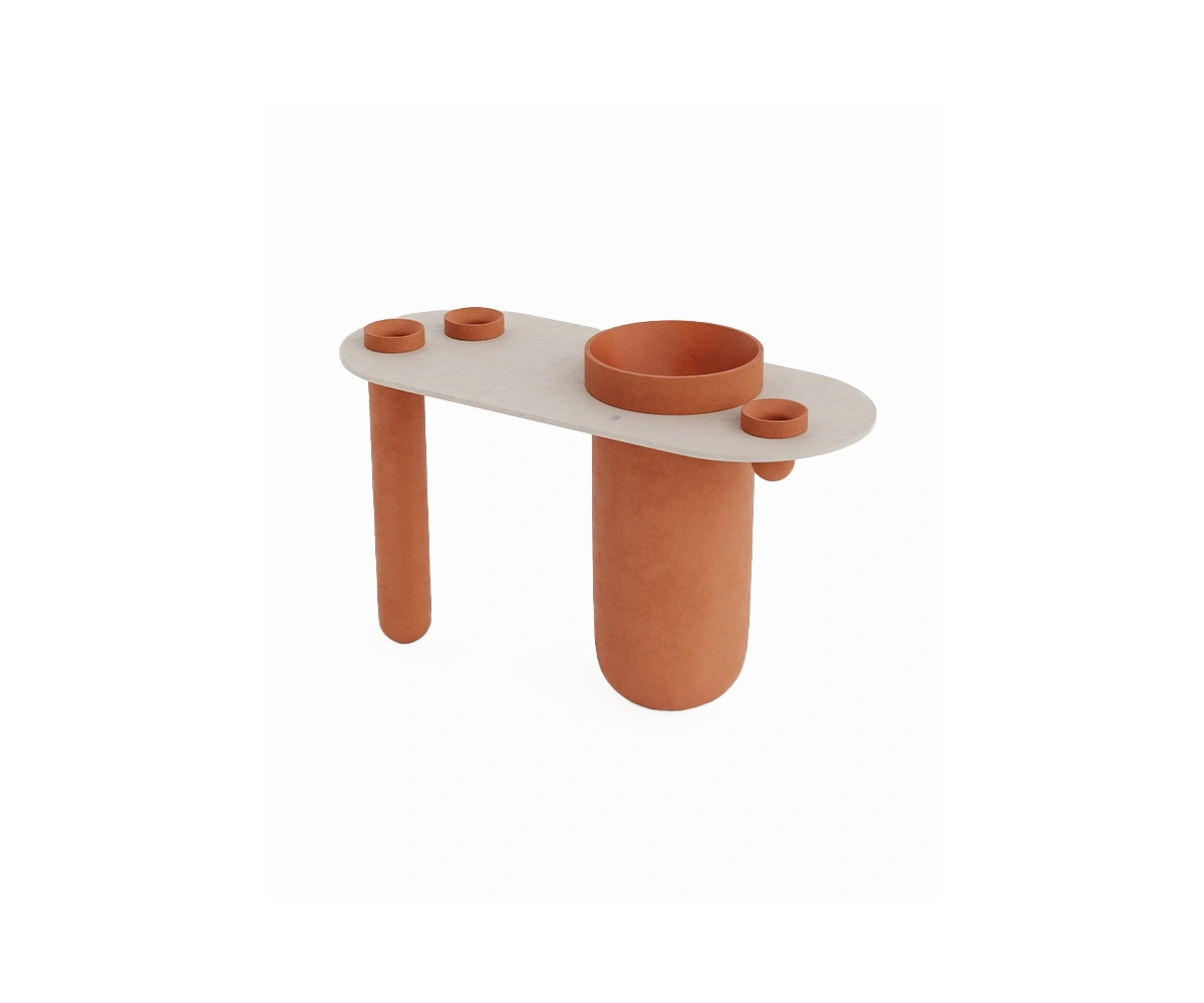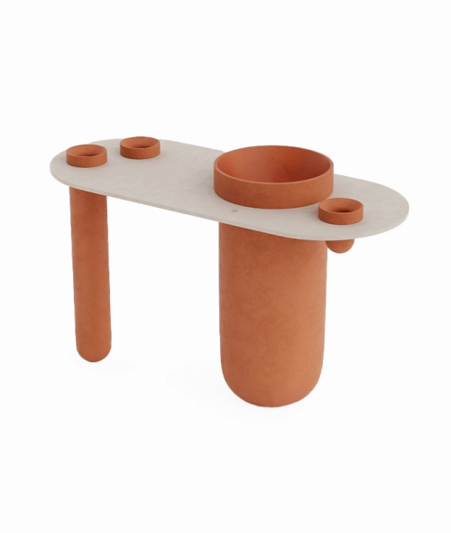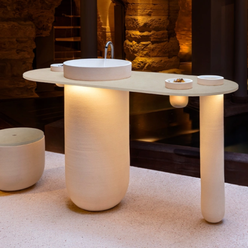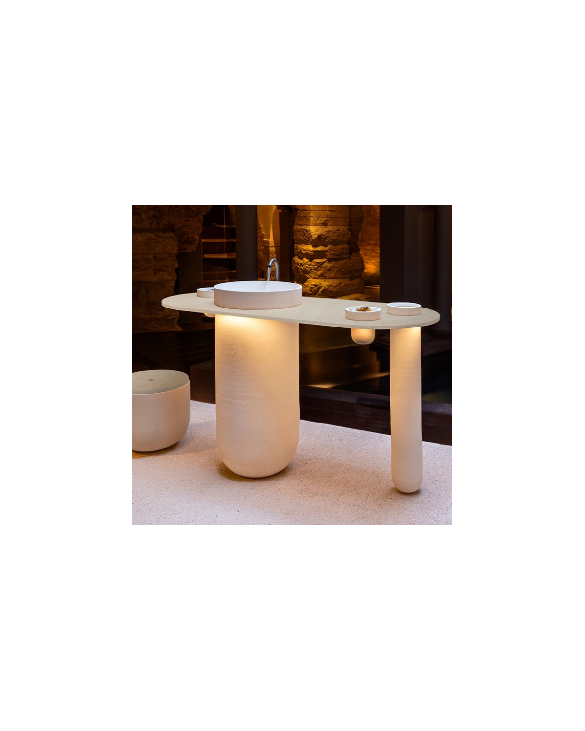 La consola consta de dos elementos estructurales cerámicos torneados a mano: uno, de mayor tamaño, puede utilizarse como lavabo, mientras que el otro sirve como accesorio. Completan el diseño una serie de contenedores cerámicos suspendidos. Toda la pieza está insertada por una fina tapa de aluminio con diseño de panal. Disponible en todos los acabados y tonos tierra.