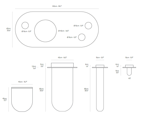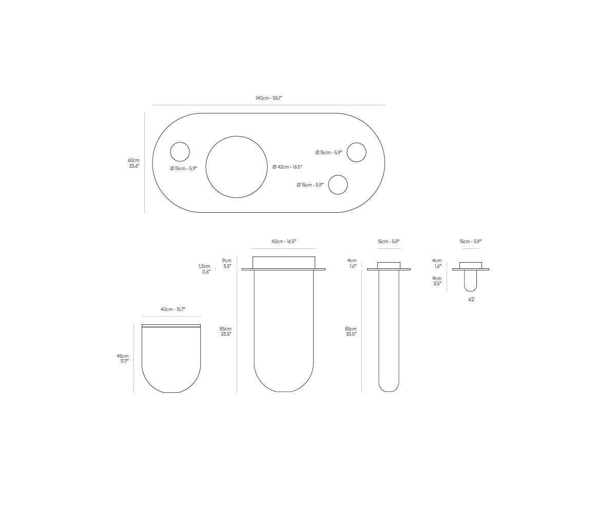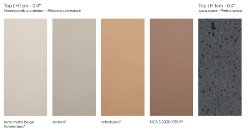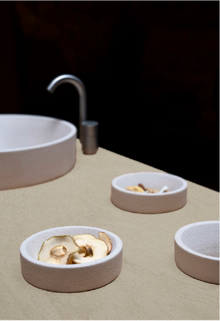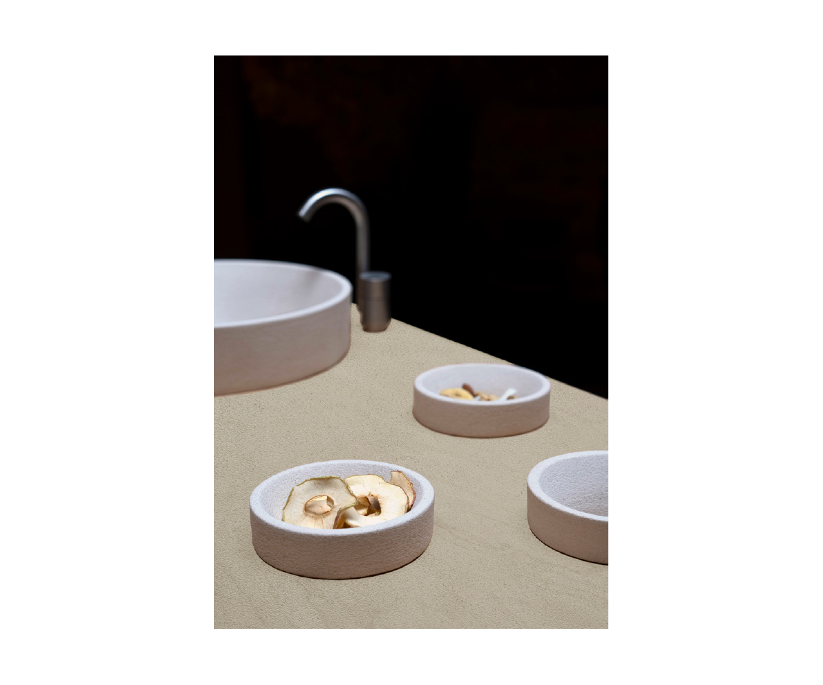 La consola consta de dos elementos estructurales cerámicos torneados a mano: uno, de mayor tamaño, puede utilizarse como lavabo, mientras que el otro sirve como accesorio. Completan el diseño una serie de contenedores cerámicos suspendidos. Toda la pieza está insertada por una fina tapa de aluminio con diseño de panal. Disponible en todos los acabados y tonos tierra.